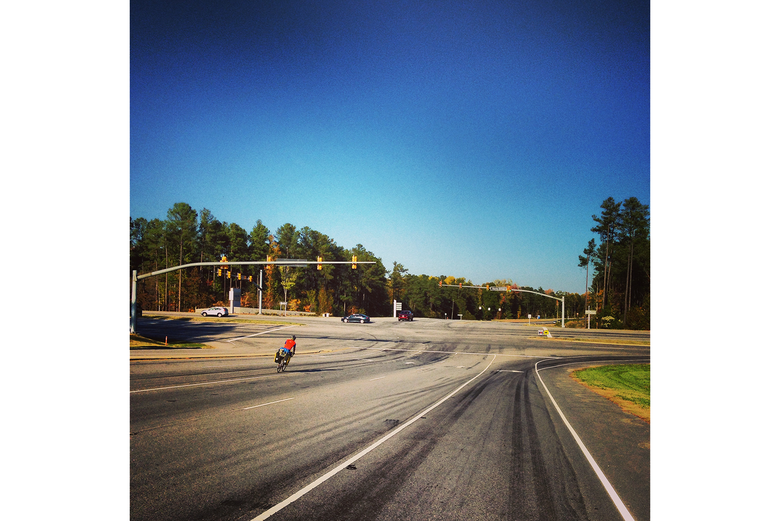carolina. brick sidewalks through UNC's campus. apartment complexes. bike paths. state parks. 5-lane highways. under bridges. over bridges.